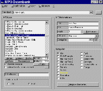 Das nächste Problem war das Interface zum Benutzer, aber durch einen glücklichen Zufall habe ich von einem Arbeitskollegen zwei LCD-Text-Display geschenkt bekommen, jedes zwar nur einzeilg mit 16 Zeichen, aber immerhin umsonst. Daraufhin haben wir uns entschieden, einen Player mit 3-Tasten-Bedienung mit einem Menü-System für die Einstellungen zu bauen. Was wir noch wollten, war eine Musik-Datenbank, bei der wir die Lieder in Kategorien einsortieren konnten und dann je nach Geschmack im Auto die Kategorien auswählen konnte, die man hören wollte. Daraufhin habe ich erst einmal die MP3-Datenbank für Windows geschrieben. Anfangs konnte man nur Lieder einsortieren und ihnen Kategorien zuweisen, aber mittlerweile ist der Funktionsumfang so hoch, das eigentlich nichts mehr fehlt, was auch nur ein bischen mit Lieder- und MP3-Verwaltung zu tun haben könnte. Der nächste Schritt war die Steuerungssoftware für den Player. Sie besteht aus zwei Teilen, einem speicherresidentem, welcher die Anzeige und das Menüsystem übernimmt. Diese Software wird quasi in Dos als Treiber geladen und zeigt die Daten auf dem Display an, die per Interrupt an die Software geschickt werden. Außerdem übernimmt diese Software die ganze Menüsteuerung und die Master-Software kann wieder per Interrupt die eingestellten Optionen abrufen. Außerdem spert dieser Treiber die Tastatur und wertete die Tastendrücke selbst aus, damit man mit der Tastatur Titel eingeben kann, die gespielt werden sollen. Dazu aber später mehr. Diese Treiber-Software hat einen eigenen Menüpunkt, mit dem man die Anzeige einstellen kann. Man kann selbst wählen, was während des Player-Betriebs wo und in welcher Zeile angezeigt werden soll. Der zweite Teil der Software, die Master-Software übernahm die restlichen, noch übrig bleibenden Funktionen, die Rechenintensiv waren, da ich das nicht im Hintergrund mit der anderen Software programmieren konnte. Die Master-Software sucht den nächsten Titel nach den in der Treiber-Software eingestellten Optionen und Kategorien aus. Zu dieser Auswahl gehört ein ausgeklügeltes Zufalls-System. Es wird beinahe komplett verhindert, das sich Titel öfters wiederholen. Das System ist so gebaut, das während einer "Sitzung", also bis zum nächsten ausschalten oder neustart sich kein Lied wiederholen kann, außer natürlich es wurden bereits alle Lieder in der Datenbank gespielt. Außerdem merkt sich die Software, wie oft ein Lied bereits gehört wurde und wertet diese Daten bei der Auswahl des nächsten Zufalls-Liedes aus, damit alle Lieder gleichmäßig oft dran kommen. Ein weiteres tolles Feature, das wir unbedingt haben wollten ist die Titelsuche durch Eingabe in die Tastatur. Dabei ist das Suchsystem aber so ausgereift, das es genügt ein paar Buchstaben des Titels einzugeben, damit er gefunde wird. Zum Beispiel gibt man "exper" ein und der Player spielt das Lied "Weather Experience" von "Prodigy".