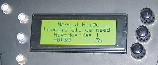 Die Ansicht des 4x20-Zeichen-Displays kann frei eingestellt werden. Ist ein Text zu lang für das Display (Zum Beispiel können Titelnamen bis zu 30 Zeichen haben) wird der Text einfach durch die Zeile gescrollt. Die Bedienung ist denkbar einfach mit 3 Tasten: Zwei mal für links/rechts oder hoch/runter, oder +/-, oder... und eine Taste zur Auswahl, bestätigung, etc. Im normalen Player-Betrieb haben die zwei link/rechts-Tasten die gleiche Funktion, wie bei einem CD-Player: kurzes drücken heißt nächstes Lied, oder Lied-Anfang bzw. letztes Lied. Gedrückt halten heißt spulen. Der dritte Taster ruft das Menü auf. Der erste Menü-Punkt ist Pause/Weiter, das heißt, wenn man diesen Taster zwei mal hintereinander drückt ist der Player in der Pause, oder spielt weiter. Wenn man im Menü ist, springt der Player automatisch ein paar Sekunden, nach dem nichts mehr gedrückt wurde wieder in die normale Ansicht zurück. Im Menü selbst können die ganzen Einstlellungen für den Player vorgenommen werden. Man kann Auswählen, welche Musik-Kategorien man hören möchte, oder man wählt gleich ein ganzes Kategorie-Schema aus. Man kann genau definieren, was während des Player-Betriebs wo im Display angezeigt werden soll. Weiterhin kann man Einstellungen zur Scroll-Geschwindigkeit und zum Klang machen. Man kann die Lautstärke, den Bass, die Höhen und die Surround-Lautstärke einstellen. Der Surround-Effekt (Wide-Stereo) ist wirklich klasse. Eine weitere Einstellungsmöglichkeit ist die Zufalls-Einstellung. Hier kann gewählt werden, wie das Zufallssystem arbeiten soll. Während der Player das nächste Lied per Zufall auswählt, erstellt er intern eine Liste der Lieder, nach ihrer Anzahl, wie oft sie schon gehört wurden sortiert. Mit der Zufalls-Einstellung kann gewählt werde, aus wieviel Prozent vom Anfang dieser Liste nur ein Lied per Zufall gewählt werden kann